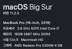 다시 한 번 언급하면, 맥북 16인치에 Big Sur 운영체제를 이용하고 있다.