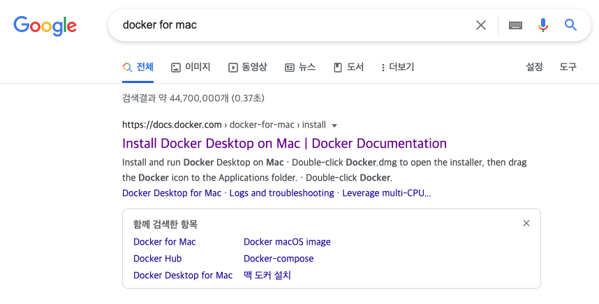 공식 홈페이지로 들어가려면 "Docker for mac" 이라는 키워드로 검색하면 아래처럼 공식 홈페이지 링크가 나온다.
