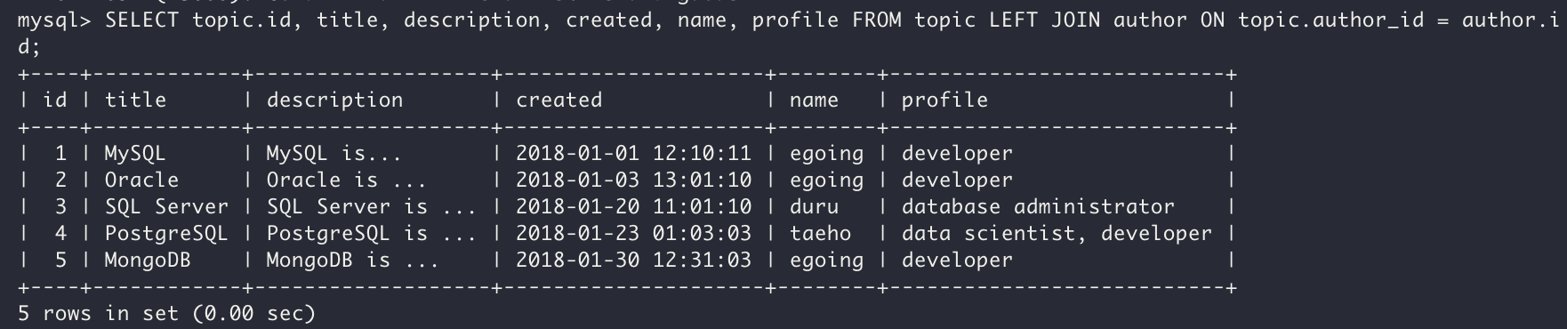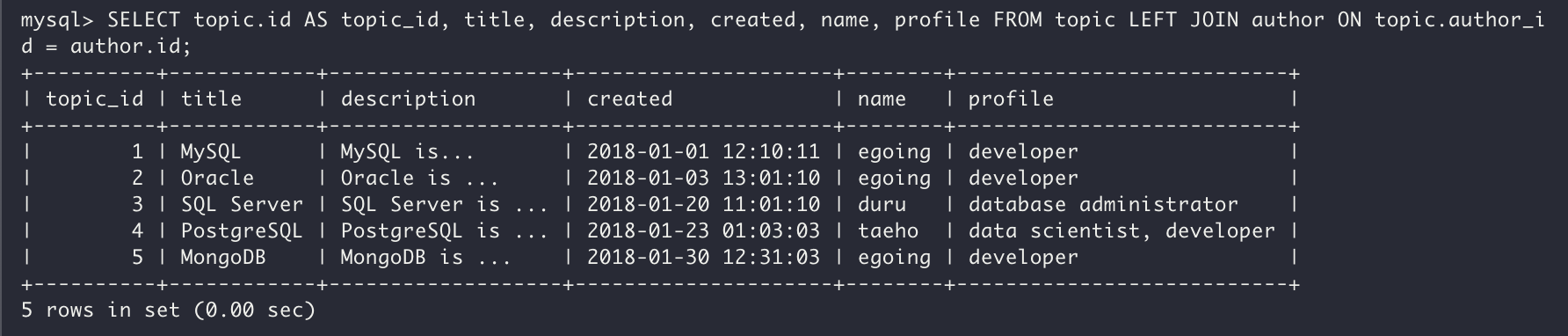 SELECT topic.id AS topic_id, title, description, created, name, profile FROM topic LEFT JOIN author ON topic.author_i