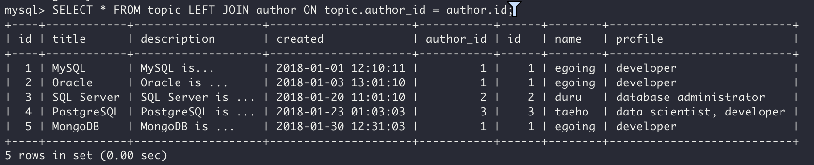 SELECT id, title, description, created, name, profile FROM topic LEFT JOIN author ON topic.author_id = author.id;