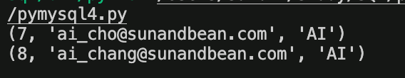 다음으로, SQL 커맨드를 mysql로 보낸 목적이 특정 결과를 받아보기 위함이라, mysql에서 return된 결과를 보는 부분이 res = cursor.fetchall() 로 추가됐다.