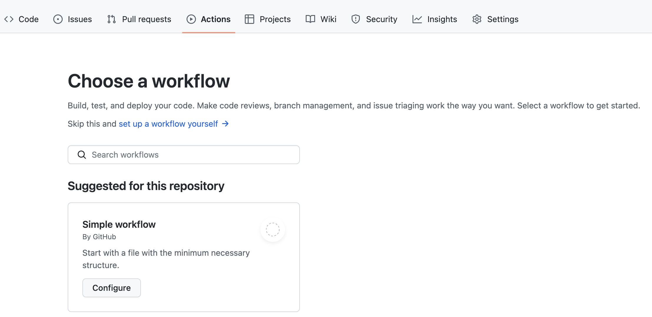 이 화면을 돌아다녀 보면 여러 프리셋들이 있지만, 일단 Simple workflow의 Configure 버튼을 눌러 선택한다.