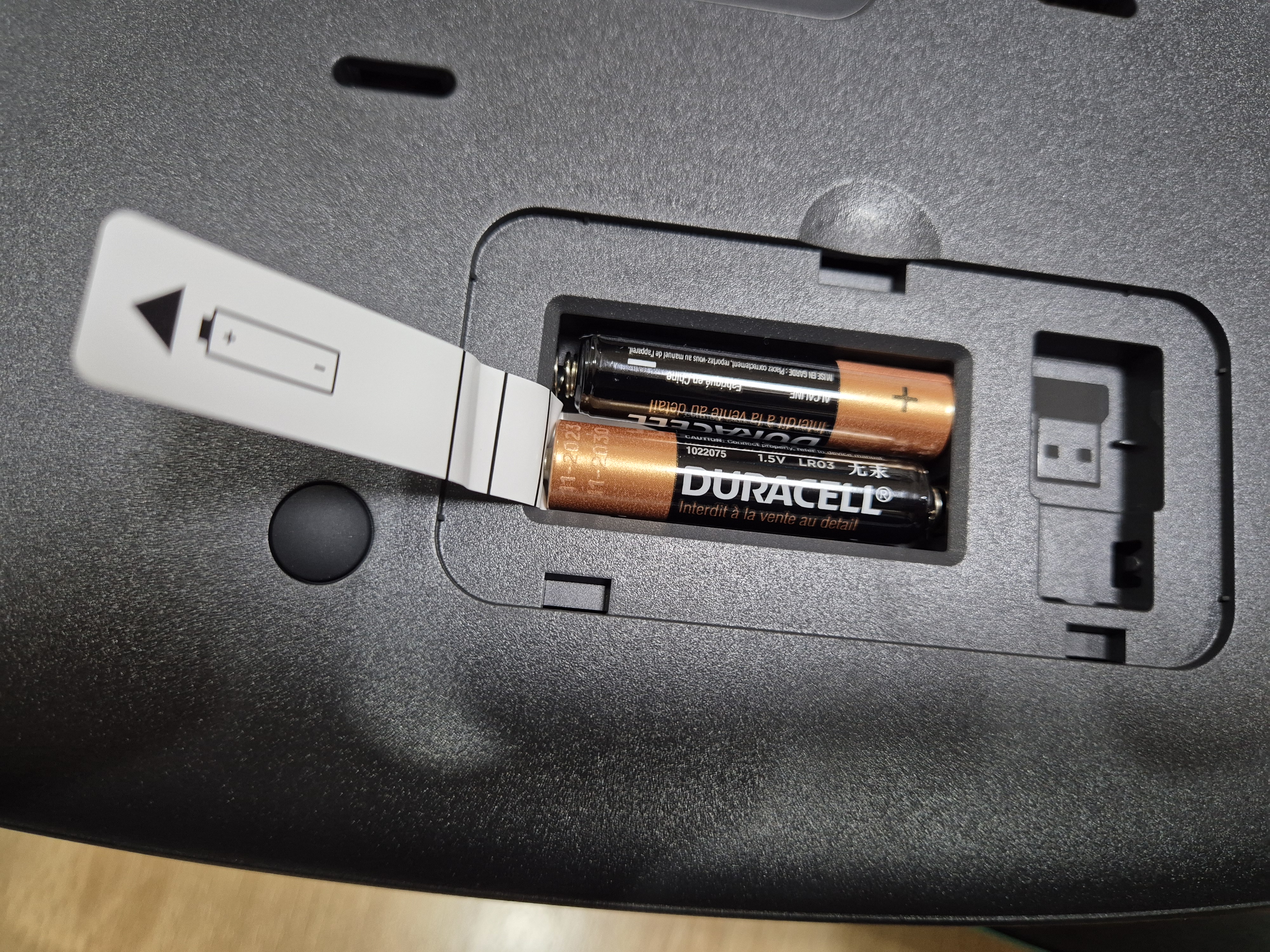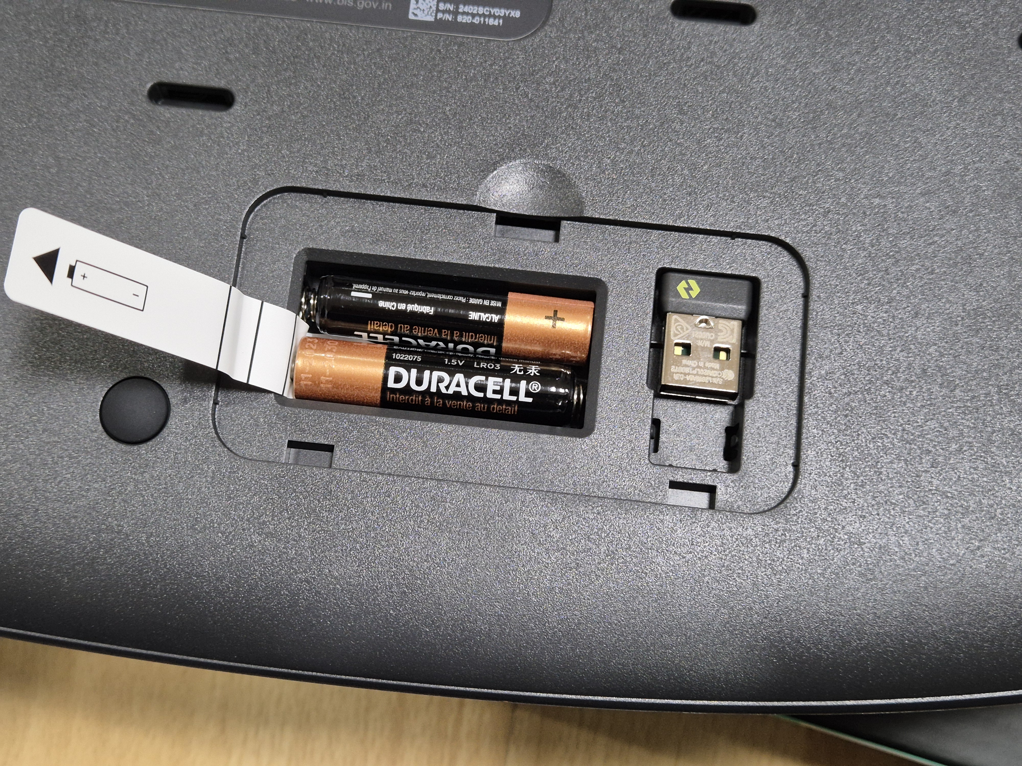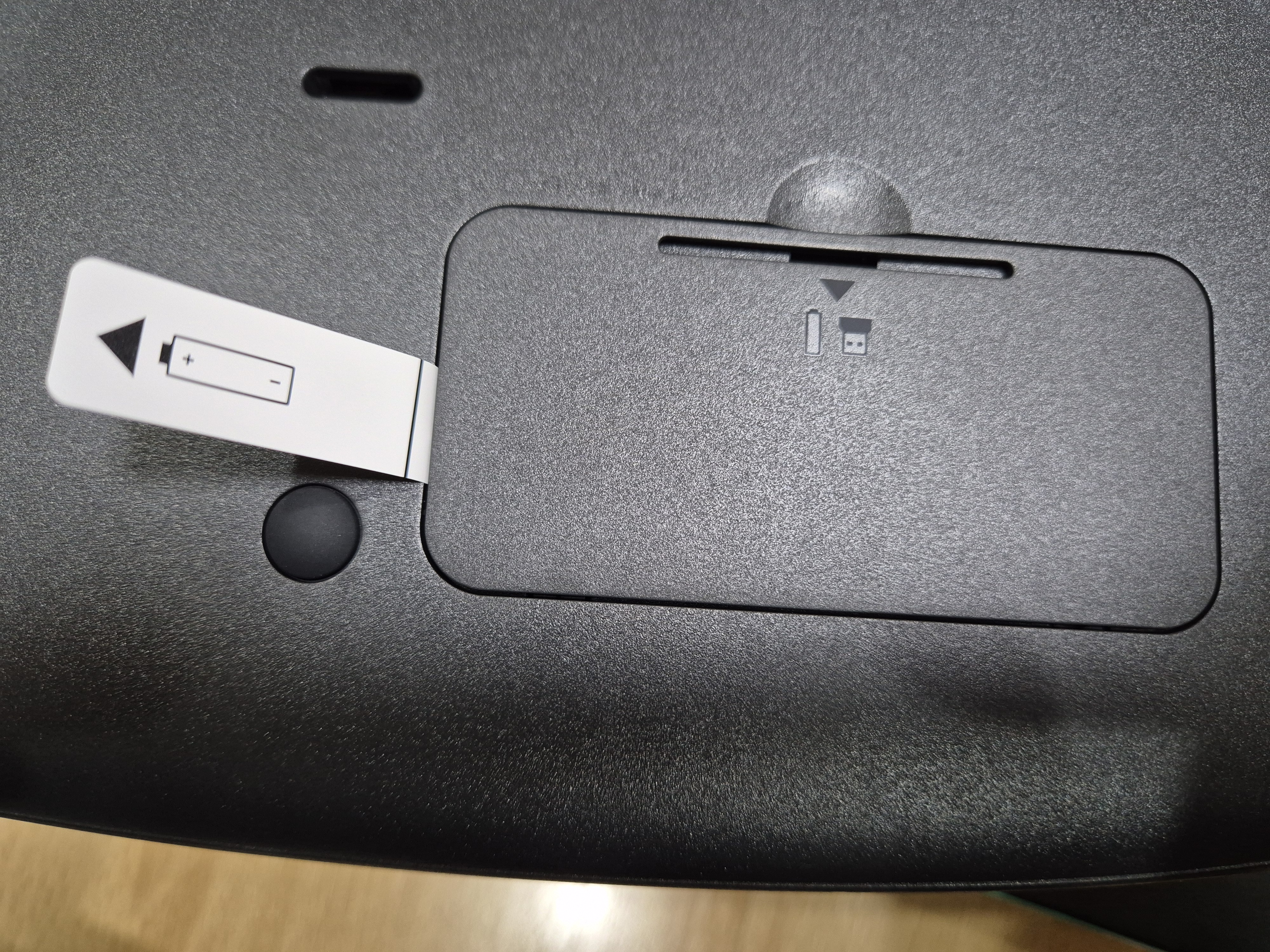 뒷판을 보면 건전지를 사용해서 동작하는 키보드라는걸 알 수 있는 표시가 있다.